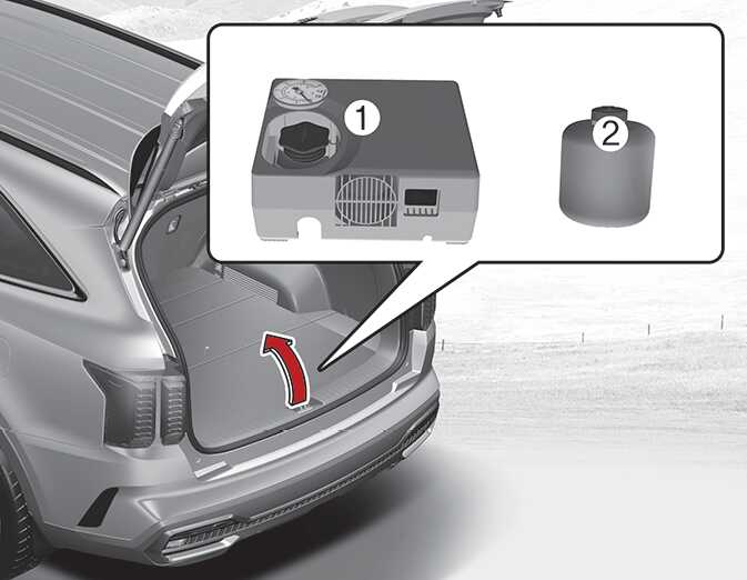 사용 후 타이어 리페어킷을 실런트(봉합제) 용기와 컴프레서가 조립된 상태로 차내 제자리에 두십시오.