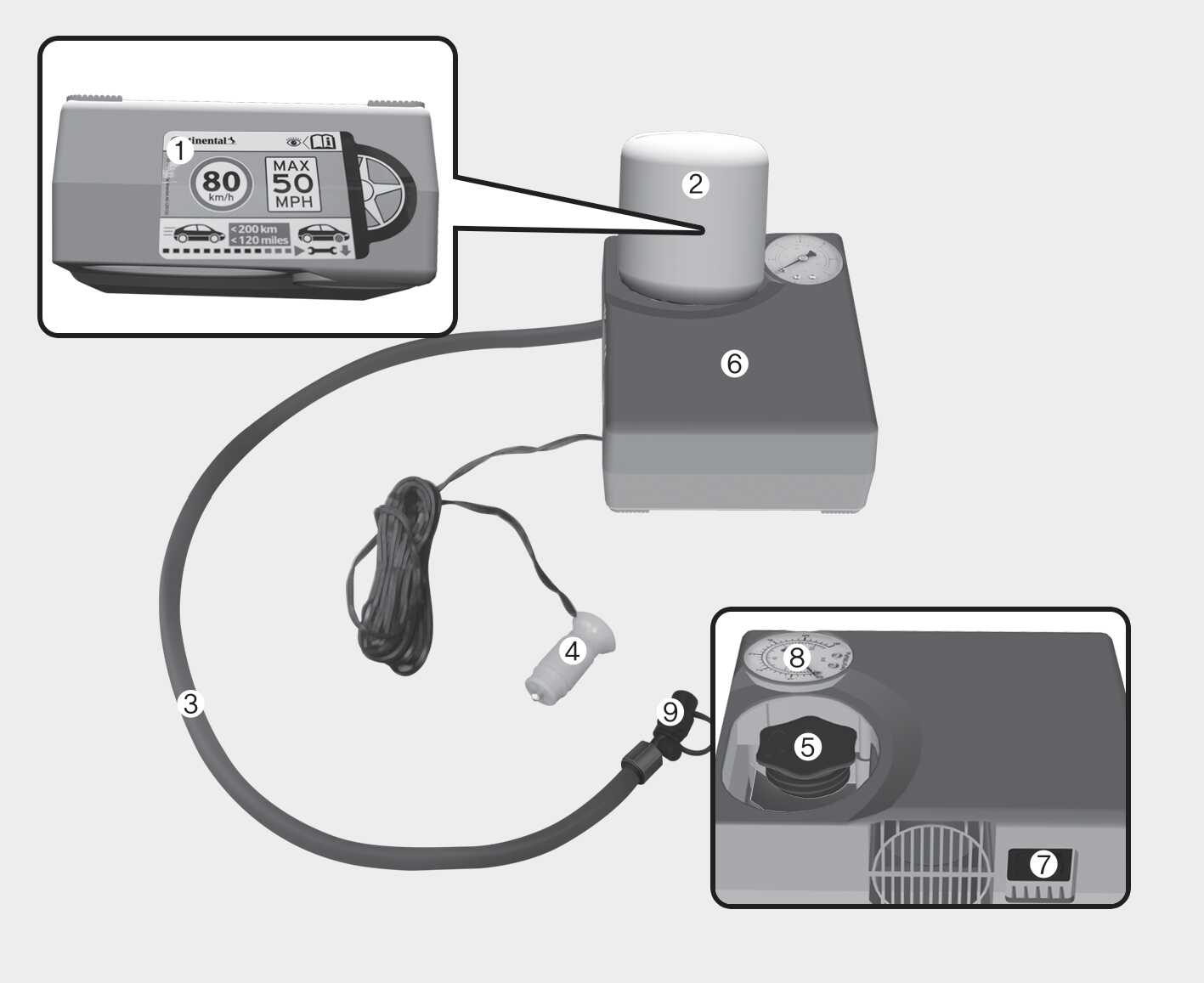 케이블과 커넥터를 이용해 컴프레서와 차량 파워 아웃렛을 연결하십시오.