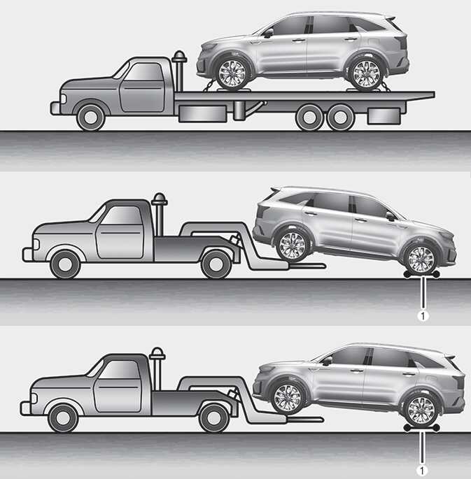견인하는 가장 좋은 방법은 견인 차량에 차량을 실어 운반하는 상차 견인이며 상차 견인이 불가할 경우에는 앞 또는 뒷 타이어를 지그에 올리고 나머지 타이어를 지면에 닿지 않도록 돌리(1)를 사용하여 견인하십시오.