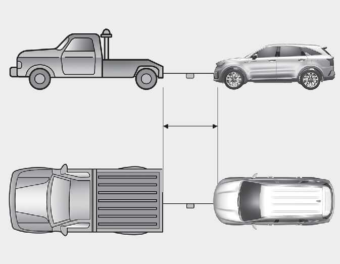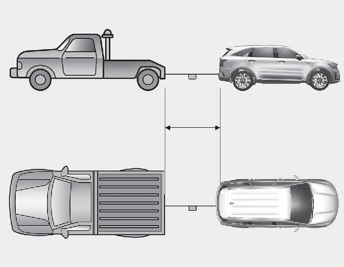 견인 시 운전자는 조향 및 브레이크 조작을 위해 반드시 피견인차량에 탑승해야 합니다. 운전자 외 인원은 탑승하지 마십시오.