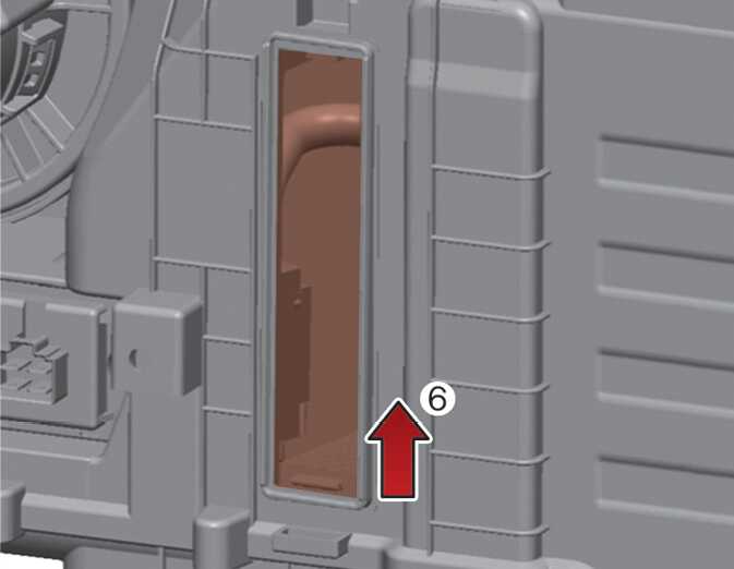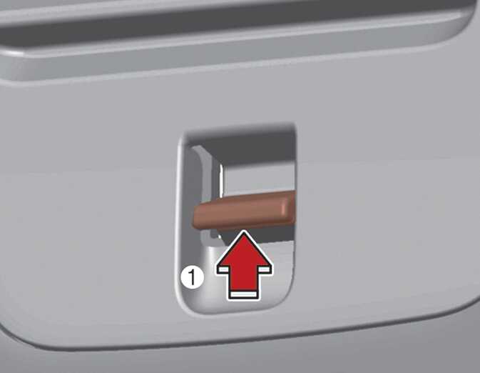 트렁크룸 우측에 있는 후석 에어컨 전용에어필터 커버의 후크(1)를 위로 밀어 누르십시오. 이 상태에서 커버를 앞으로 당겨 분리하십시오(2)..