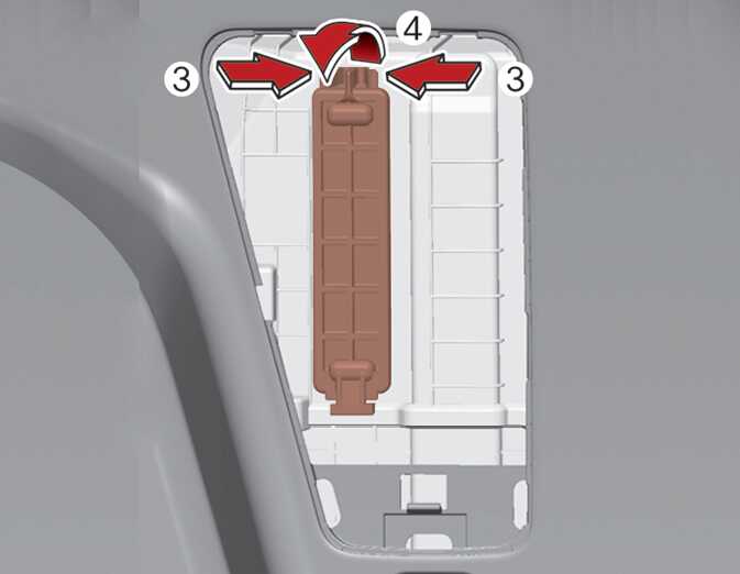 커버를 제거한 상태에서 후석 에어컨의 에어필터 받침대 커버의 상단 후크(3)를 누르면서 잡아당겨 분리하십시오(4).