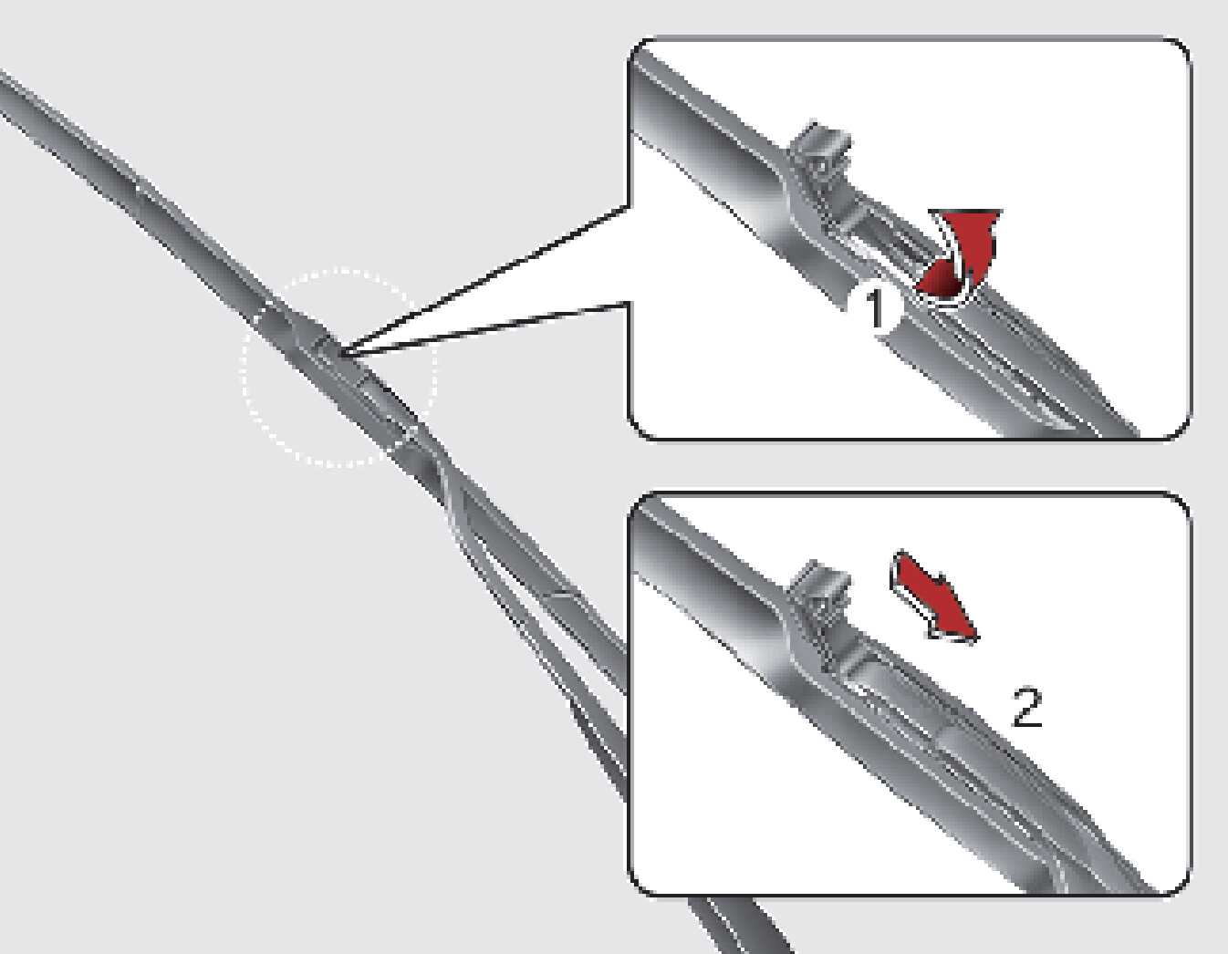 와이퍼 블레이드가 분리된 상태에서 와이퍼 암이 유리창에 닿지 않도록 주의하십시오. 유리창이 파손될 수 있습니다.