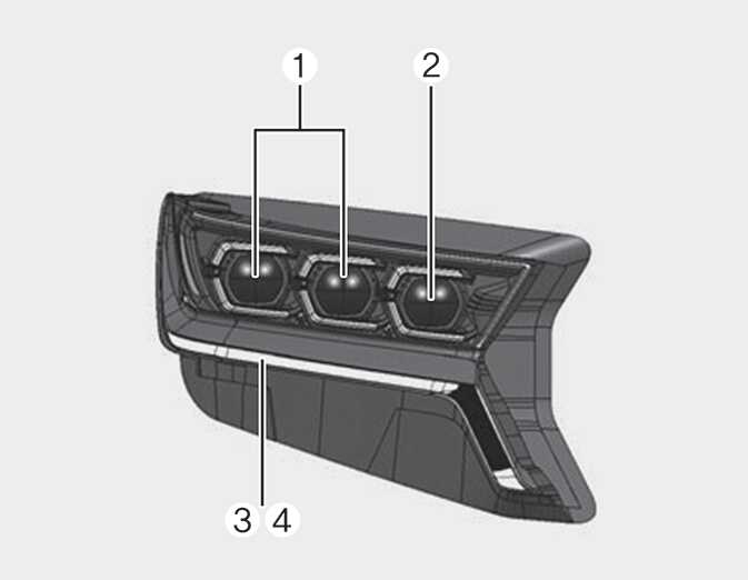 LED 타입의 전조등(하향/상향)(1,2), 방향지시등(3), 차폭등/주간 주행등(4)이 켜지지 않을 경우에는 가까운 자사 직영 서비스센터 또는 서비스협력사에 의뢰하십시오.