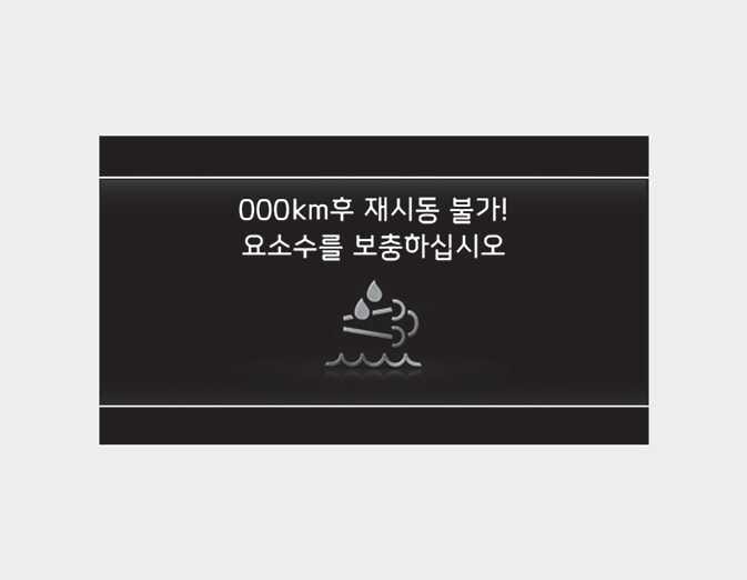 )과 함께 "요소수가 고갈되어 재시동이 불가합니다" 경고 메시지가 표시되며, 신속히 요소수를 보충하십시오. 요소수 보충 없이 주행하면 요소수 부족으로 재시동 시 시동이 걸리지 않을 수 있습니다. 주행 습관 및 도로 환경 등에 따라 표시된 주행 가능 거리와 실제 주행 거리는 달라질 수 있으므로 신속히 요소수를 보충하십시오.