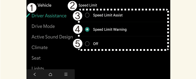 Система контроля ограничения скорости: Интеллектуальная система контроля ограничения скорости сообщит водителю об ограничении скорости и дополнительных дорожных знаках, а также предупредит водителя, если скорость автомобиля превысит установленное ограничение. Кроме того, интеллектуальная система контроля ограничения скорости будет информировать водителя о необходимости изменения скорости, заданной в системе ручного ограничения скорости или интеллектуального круиз-контроля (при наличии), с целью соблюдения скоростного режима.