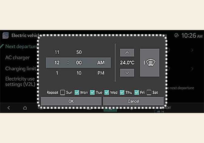 Sie können das Datum und die Uhrzeit, wann die Batterie geladen werden soll, sowie die Temperatur für die Klimaanlage einstellen. Außerdem können Sie einstellen, zu welcher Zeit der Ladevorgang beginnen soll und dabei eine Einstellung in der Nebenzeit verwenden. |