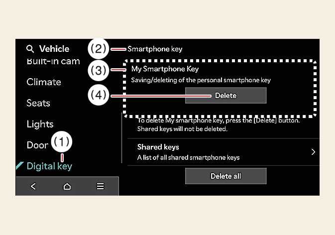 Wenn der digitale Schlüssel (Smartphone) auf dem Smartphone gelöscht wird, wird auch der im Fahrzeug gespeicherte digitale Schlüssel gelöscht.