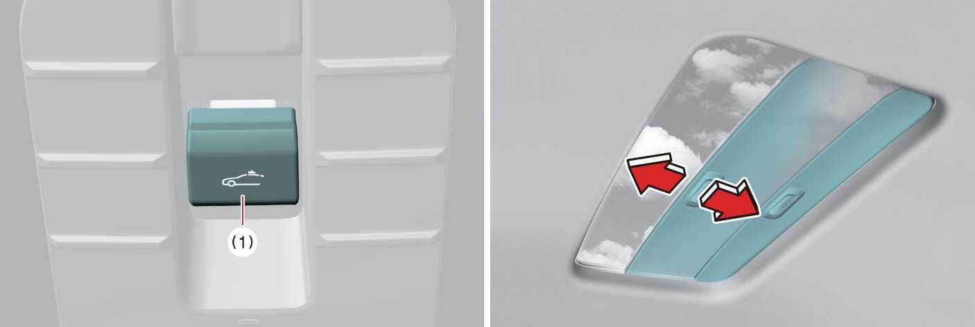 Die Sonnenblende öffnet sich automatisch, wenn sich das Schiebedachglas durch Drücken des Schiebedachschalters (1) nach hinten geöffnet wird, aber die Sonnenblende schließt sich nicht automatisch, wenn das Schiebedachglas geschlossen wird. Außerdem kann die Sonnenblende allein nicht geschlossen werden, wenn das Schiebedachglas geöffnet ist.