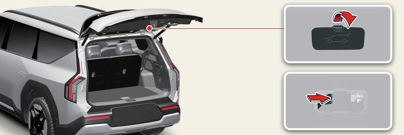 Merken Sie sich für den Notfall, wo sich der Notentriegelungshebel der Heckklappe befindet und wie er bedient wird, damit Sie sich befreien können, wenn Sie versehentlich im Kofferraum eingeschlossen sind.