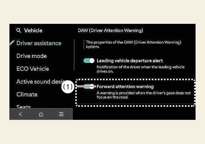 Das Fahreraufmerksamkeits-Warnsystem vorne schaltet sich immer ein, wenn das Fahrzeug neu gestartet wird.