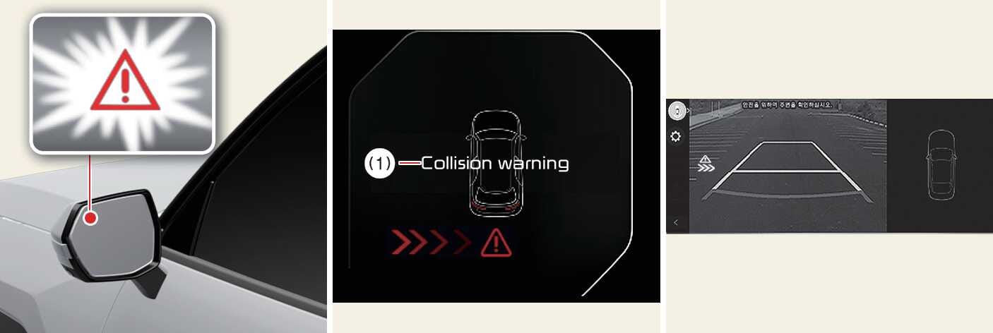 Die Kollisionswarnung warnt den Fahrer durch eine Warnleuchte in den Außenspiegeln, mit einer Warnmeldung, sowie durch einen Warnton und Lenkradvibration.