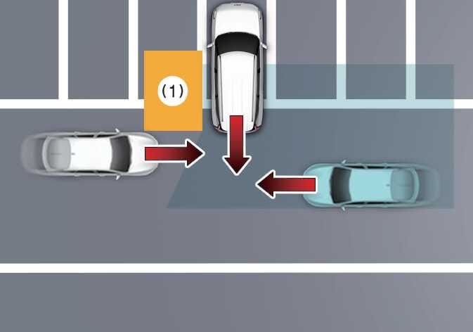 (1) Bauwerk Der Heckverkehr-Kollisionsvermeidungsassistent kann beim Fahren in der Nähe eines Fahrzeugs oder einer Konstruktion in ihrer Funktionalität eingeschränkt sein und sich von links oder rechts nähernde Fahrzeuge möglicherweise nicht erkennen. In diesem Fall warnt die Funktion den Fahrer möglicherweise nicht und steuert die Bremsen nicht, wenn dies erforderlich ist. Prüfen Sie beim Zurücksetzen immer Ihre Umgebung. |