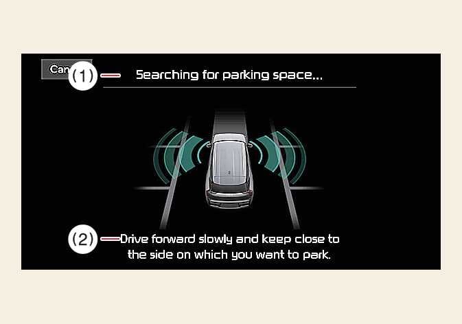 Wenn Sie weiterfahren, ohne anzuhalten, nachdem das Bild zur Auswahl der Einparkmethode erscheint, kehrt die ferngesteuerte intelligente Einparkhilfe zum vorigen Schritt zurück und sucht nach einer Parklücke.