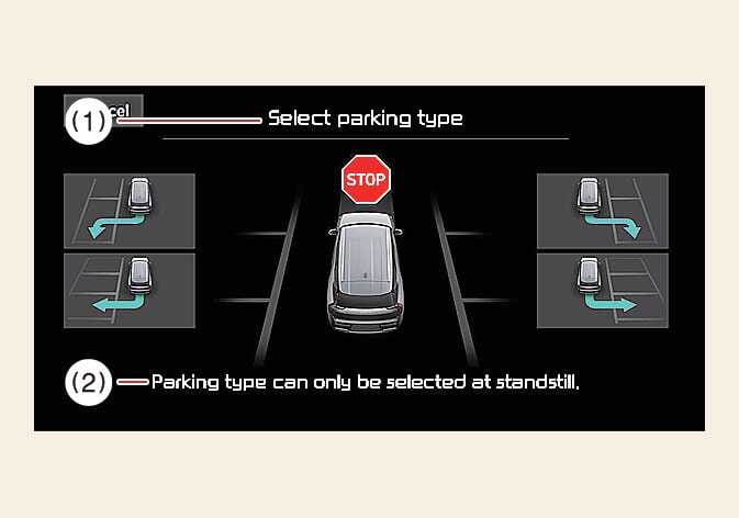 Wenn das Fahrzeug durch Drücken des Bremspedals angehalten wird, berühren Sie den Bildschirm des Infotainment-Systems, um gewünschte Einparkart auszuwählen.