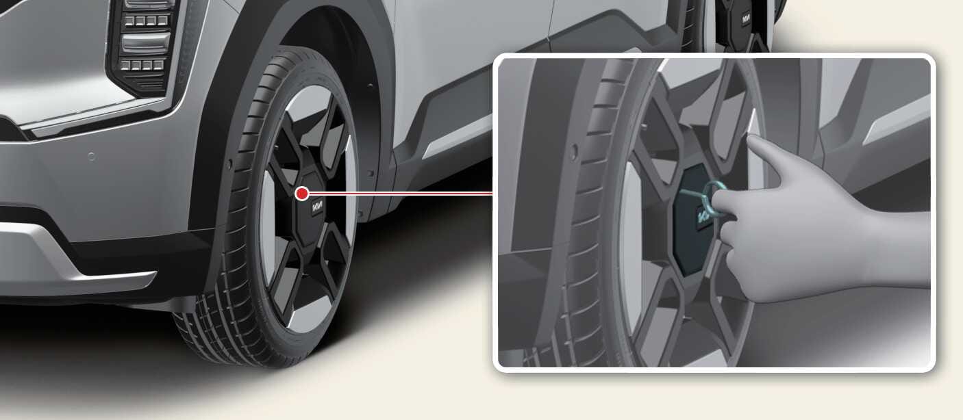 Nehmen Sie das Abziehwerkzeug aus dem Reifen-Mobilitäts-Kit heraus. Führen Sie das Werkzeug in das Loch ein und ziehen Sie die Radabdeckung heraus.