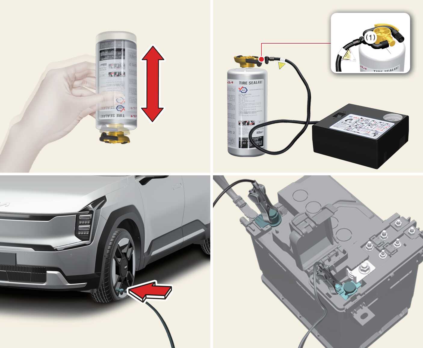 Belassen Sie das TMK (Reifen-Mobilitäts-Kit) auch nach der Anwendung mit dem Einspritzschlauch an der Seite der Dichtmittelflasche und dem Einspritzschlauch an der Seite des Kompressors im Fahrzeug verbunden.