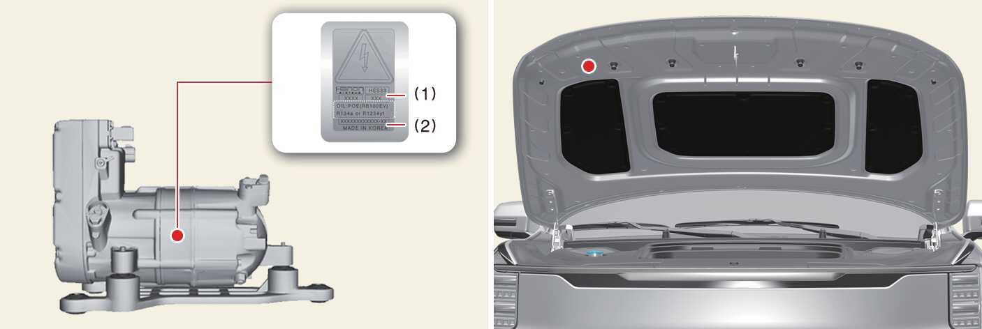 Die Kennzeichnung des Klimaanlagenkompressors enthält Informationen über die Art des Kompressors, mit dem Ihr Fahrzeug ausgestattet ist, d.h. Modell, Herstellerartikelnummer, Produktionsnummer, Kältemittel (1) und Kältemittelöl (2).