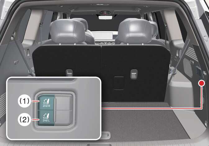 Drücken Sie den Schalter zum Umklappen/Ausklappen der Sitze in der 2. Sitzreihe (1 oder 2) auf der rechten Seite des Gepäckraums.