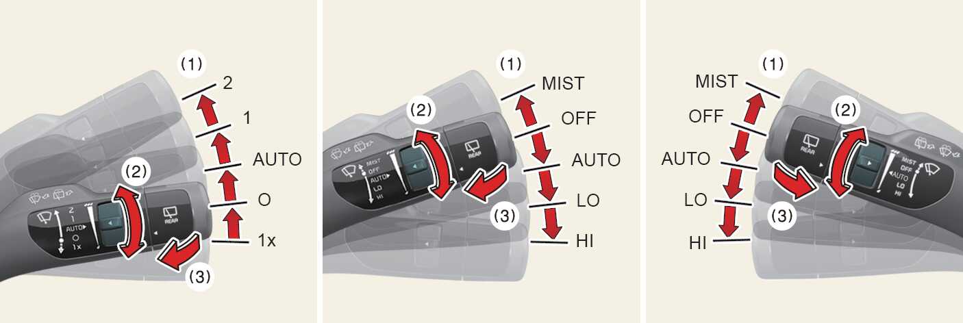 MIST (1x): Einfaches Wischen, AUS (0): Aus, AUTO: Automatische Wischersteuerung, LO (1): Langsame Wischergeschwindigkeit, HI (2): Schnelle Wischergeschwindigkeit