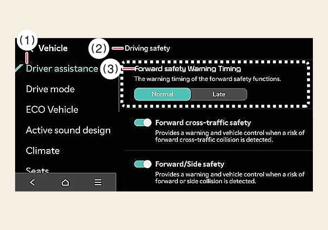 Wenn das Fahrzeug eingeschaltet ist, wählen Sie am Infotainment-System , um den Zeitpunkt der Aktivierung des Frontalkollisions-Vermeidungsassistenten zu ändern.