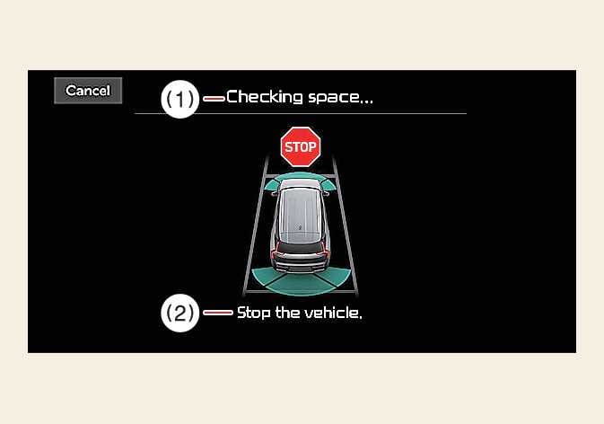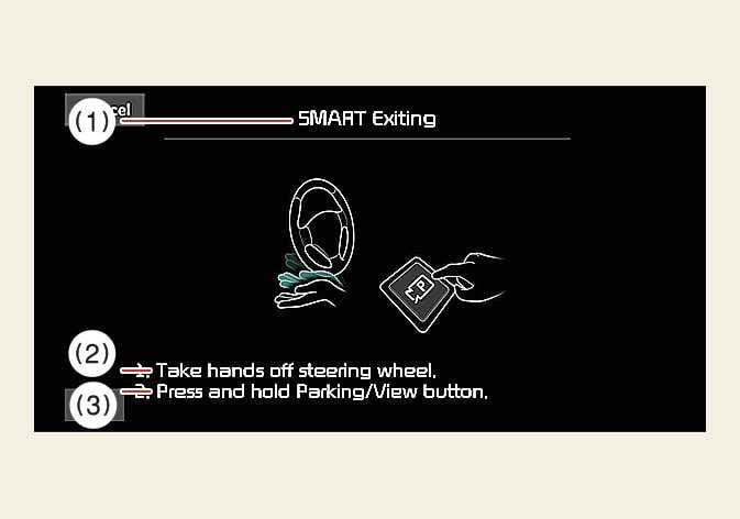 ) gedrückt, bis das Fahrzeug die gewünschte Ausparkposition erreicht hat. Wenn das Fahrzeug die gewünschte Ausparkposition erreicht hat, erscheint auf dem Bildschirm des Infotainment-Systems ein Hinweis, dass der Ausparkvorgang abgeschlossen ist.-