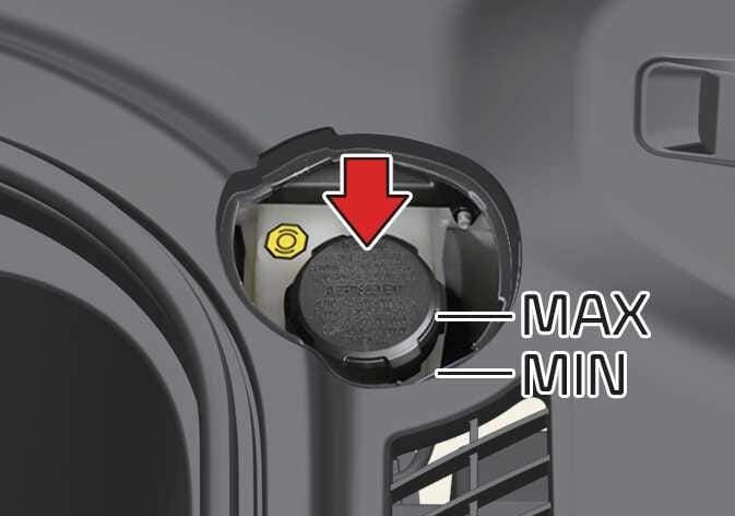 Prüfen Sie regelmäßig, dass der Füllstand im Bremsflüssigkeitsbehälter zwischen MIN und MAX liegt. Der Pegel sinkt mit zunehmender Laufleistung des Fahrzeugs. Dies ist ein normaler Zustand, der auf den Verschleiß der Bremsklötze zurückzuführen ist.