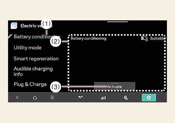 Battery temperature status information is displayed on the infotainment system screen, and you can use a manual switch to turn ON or OFF the Battery Conditioning function, and display the status of battery conditioning operation as well.