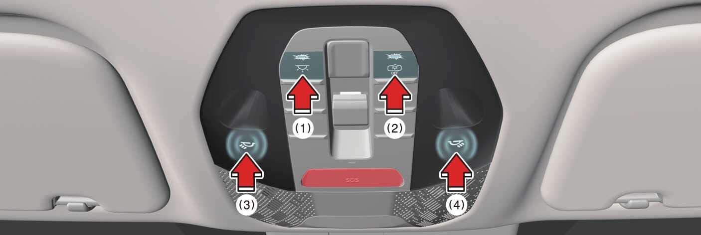 : The front and rear seat lamps turn on, and pressing again turns all lamps off. If you press and hold the corresponding button for about 1.5 seconds or more while the status indicator is on, the brightness of the front and rear seat lamps changes simultaneously. When you release the button at the desired brightness, the set brightness is saved.