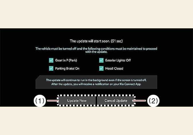 If you press the Update Now button on the screen, the vehicle will begin installing the update automatically. The following conditions must be satisfied: