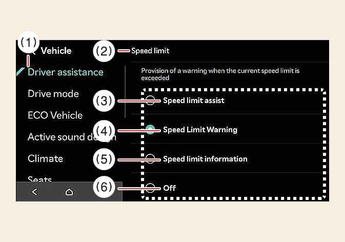 When you turn off and restart the vehicle, the speed limit warning will automatically turn on. Be sure to park in a safe place before setting Intelligent Speed Limit Assist.