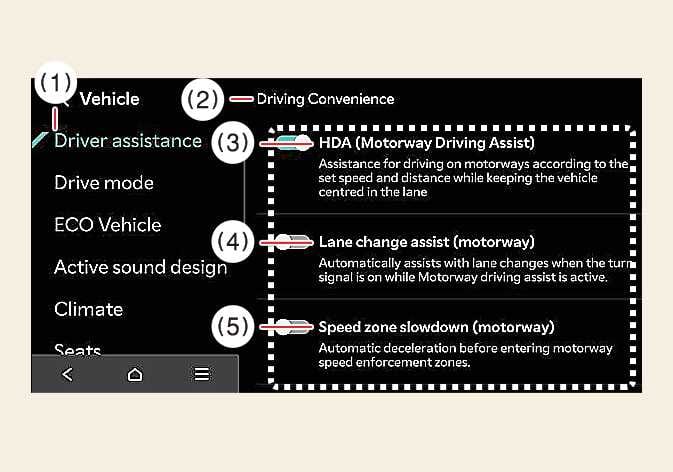If HDA (Motorway Driving Assist) is selected, it helps maintain distance from the vehicle ahead, maintain the set speed, and helps center the vehicle in the lane.