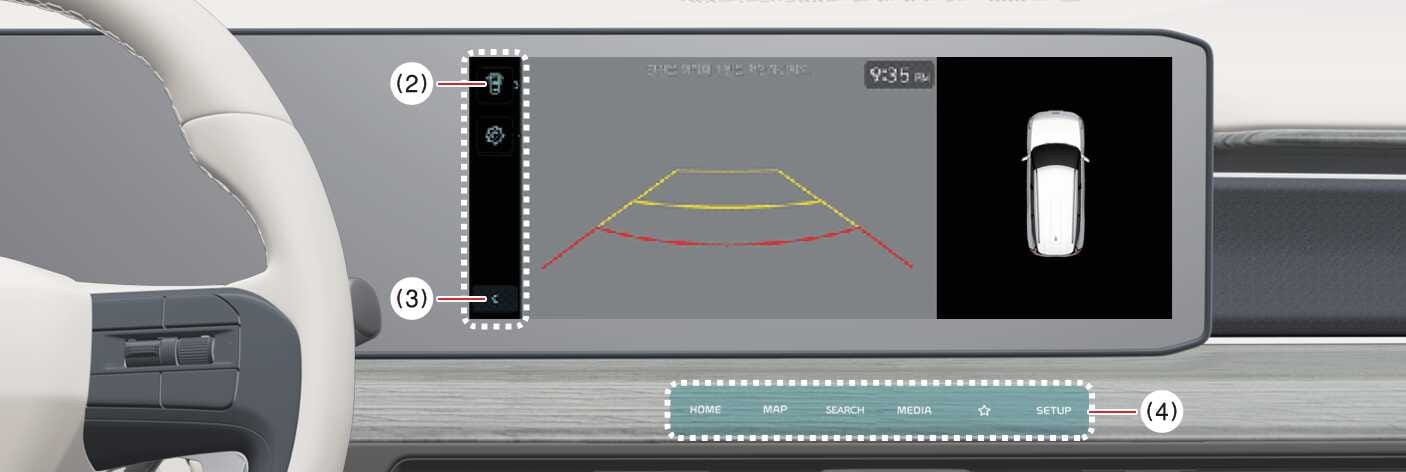 Pressing the View switching button (2) with the Rear top view on the screen allows you to select rear top view, rear view, or rear wide view.