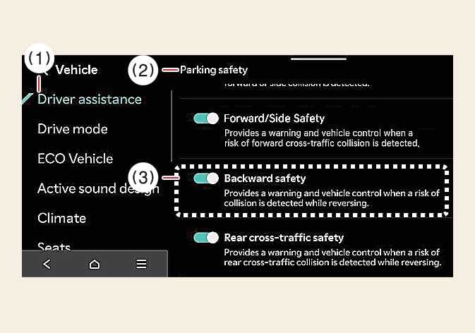 Backward safety will be selected and Parking Collision-Avoidance Assist settings will be retained whenever the vehicle is restarted.