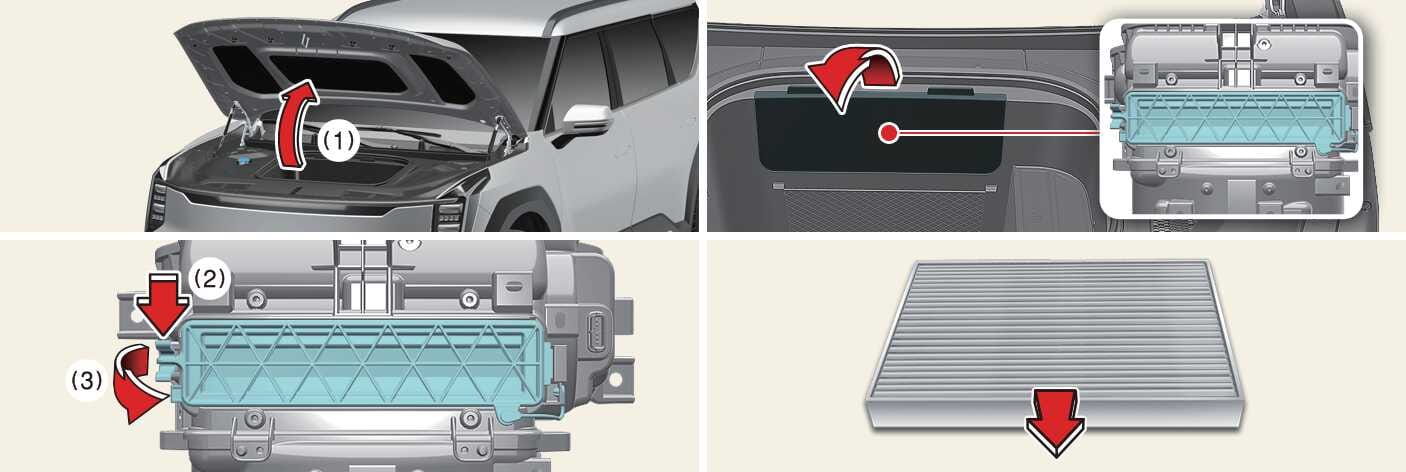 Remove the climate control air filter cover (2) by pulling out left side of the cover (3).