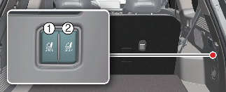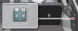 Press the 2nd row seat folding/unfolding switch (1 or 2) located on the right side of the luggage compartment.