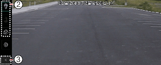 서라운드 뷰 모니터 화면의 뷰 전환 버튼(2)을 눌러 전방 뷰 또는 와이드 뷰를 선택할 수 있습니다.