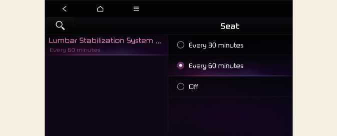 Front driver seat can select the feature to activate after 30 or 60 minutes of driving. Lumbar support will automatically adjust through full range of positions, then return to the initial position.