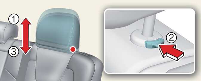 To reinstall the headrest, put the headrest poles (3) into the holes while pressing the release button (2).