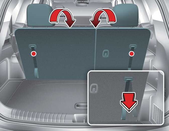 Pull on the seatback folding lever (for 2nd row) or strap (for 3rd row), then fold the seat toward the front of the vehicle. When you return the seatback to its upright position, always be sure it has locked into position by pushing on the top of the seatback.