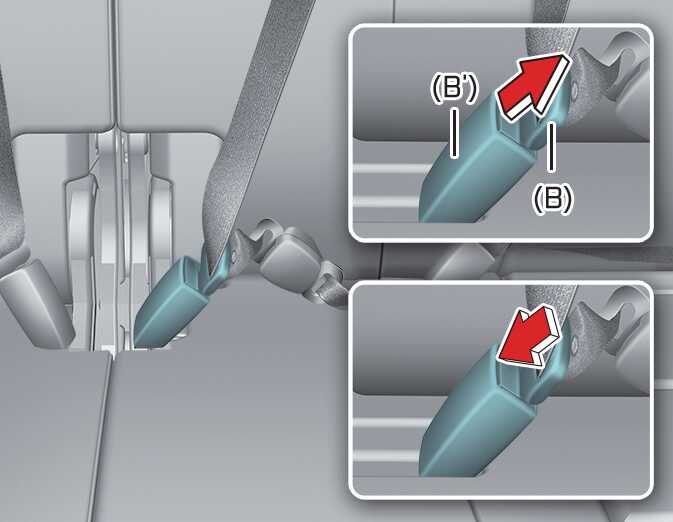 Pull out the tongue plate (B) from the pocket. Pull the tongue plate (B) and insert it into the buckle (B') until an audible "click" is heard, indicating the latch is locked. Make sure the belt is not twisted.