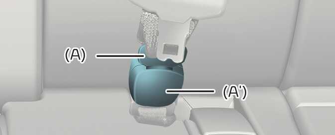 To retract the rear center seatbelt, insert the tongue plate into the web release hole (A' ). Pull up on the seat belt web and allow the web- bing to retract automatically. Insert the tongue plate (A) into the hole on the belt assembly cover.