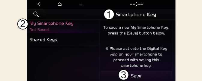 When there is a digital key (smart phone) already saved in the vehicle, the Save menu is disabled. If you want to save a digital key again, refer to How to delete Digital Key 2 Touch (Smart Phone) and follow the deleting procedure first before saving a digital key.