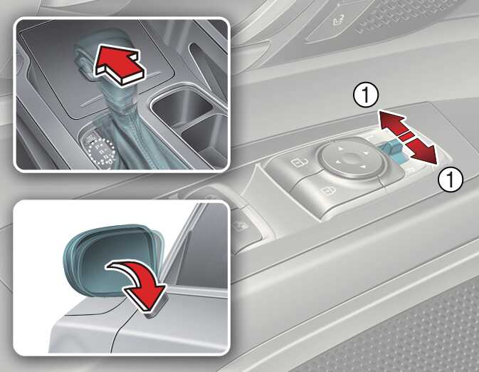 While the vehicle is moving rearward, the outside rearview mirror(s) will move downward to aid reverse parking. According to the position of the outside rearview mirror switch (1), the outside rearview mirror(s) will operate as follows: