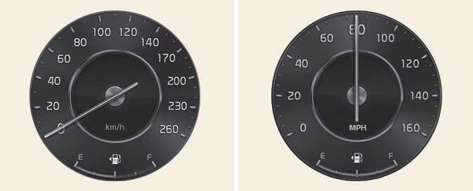 The speedometer indicates the speed of the vehicle and is calibrated in miles per hour (mph) and/or kilometers per hour (km/h).