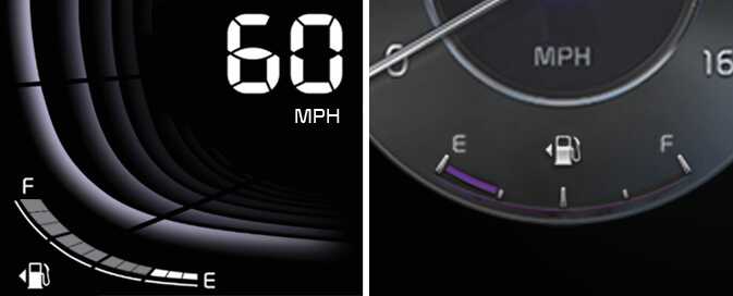 On inclines or curves, the fuel gauge pointer may fluctuate or the low fuel warning light may come on earlier than usual due to the movement of fuel in the tank.