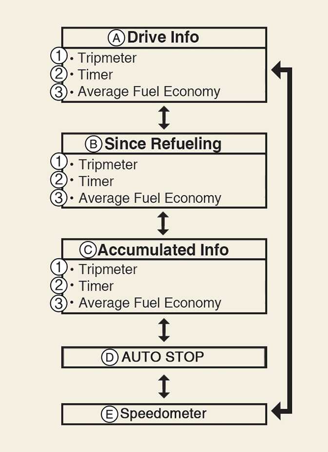 This display shows the trip distance, the average fuel efficiency, and the instant fuel efficiency (or the total driving time) since refueling.