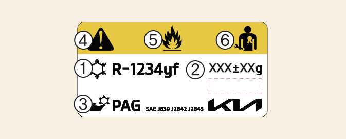 Each symbol and specification on the air conditioning refrigerant label is represented below: