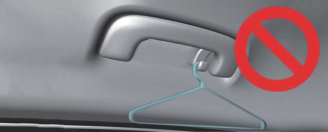 Do not hang other objects such as hangers or hard objects except clothes. Also, do not put heavy, sharp or breakable objects in the clothing's pockets. In an accident or when the curtain air bag is inflated, it may cause vehicle damage or bodily injury.