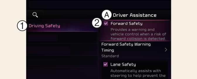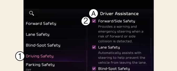 With the vehicle on, touch Settings → Vehicle → Driver Assistance → Driving Safety on the infotainment system screen to set whether or not to use each function.